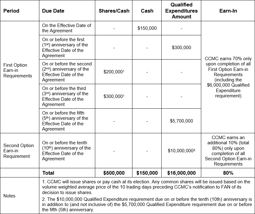 To earn an initial 70% interest in the Property, CCMC must complete the following on or before the fifth anniversary of the effective date of the Option Agreement: