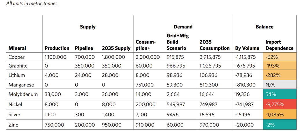 Table 1: U.S. Critical Minerals Supply and Demand Projections to 2035. Source: Carnegie Endowment for International Peace, Securing America's Critical Minerals Supply (October 8, 2025)