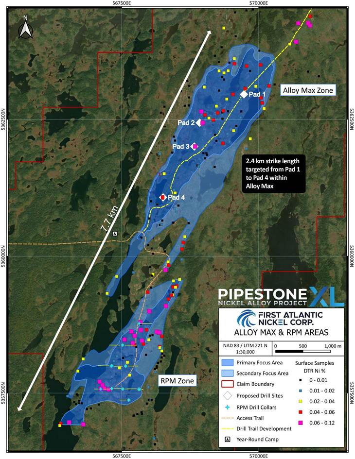 GRAND FALLS-WINDSOR, Newfoundland and Labrador - (GlobeNewsWire - April 8, 2026) - First Atlantic Nickel Corp. (TSXV: FAN) (OTCQB: FANCF) (FSE: P21) ("First Atlantic" or the "Company") is pleased to announce that drilling has commenced at the Alloy Max Zone, a new large-scale awaruite (Ni₃Fe) nickel-cobalt alloy discovery located 7 kilometers (km) north of the RPM Zone. The Alloy Max Zone represents the Company's second major target area within the 30 km Pipestone Ophiolite Complex at its Pipestone XL Nickel-Cobalt Alloy Project in central Newfoundland. The Alloy Max discovery was first announced on March 18, 2026, following the Company's ongoing district-wide surface sampling program, which identified a new large area of magnetically recoverable nickel-cobalt alloy mineralization. The initial target area measures approximately 4 km in length and 1.2 km in width.